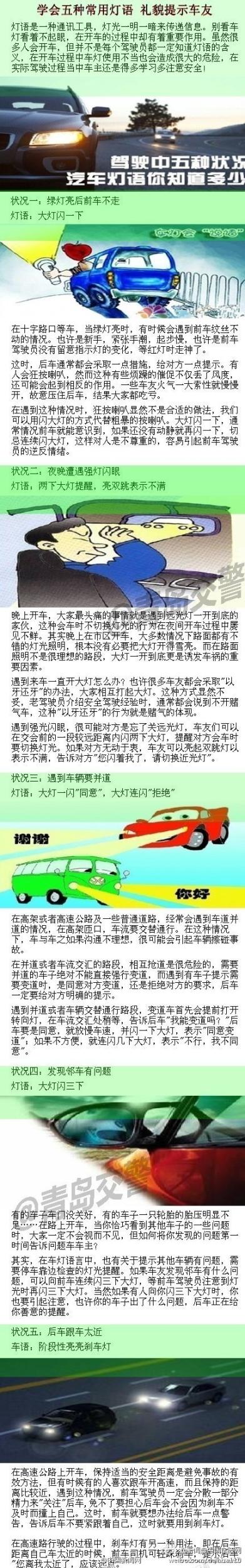 開車不會(huì)燈語(yǔ),相當(dāng)于人不會(huì)說話。綠燈亮了,前車不走,別狂按喇叭,可用大燈閃一下;鄰車大燈閃了三下,可能是自己的車出了問題;后車跟太近,可階段性亮亮剎車燈……“青島交警”總結(jié)出5種最常用燈語(yǔ),轉(zhuǎn)走學(xué)習(xí)!學(xué)用燈語(yǔ)是禮貌文明的體現(xiàn)哦~~~