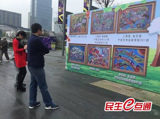 活動現場,一側是“綠色出行從我做起”征文征畫評選活動的獲獎作品展示,獲獎的30多位小記者用文字和畫筆勾勒出的他們心目中的綠色出行藍圖。居中一幅是寧波市藝術實驗學校的孩子們描繪的30米長卷“幸福快車”,孩子們用了幾個月的時間,畫出了一幅行進中的地鐵列車,上面滿載著小朋友的期盼與希望。