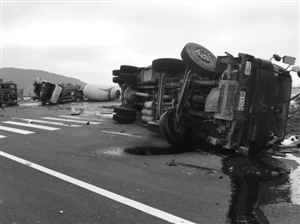 發(fā)生事故后,運(yùn)土車與水泥槽罐車同時(shí)側(cè)翻在地,汽車零件散落一地,現(xiàn)場(chǎng)一片狼藉。