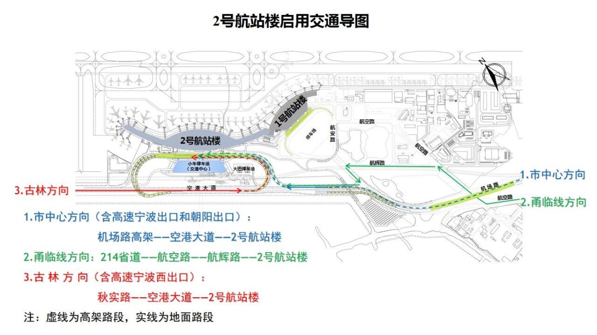 2、甬臨線方向:214省道—航空路—航輝路—2號航站樓;