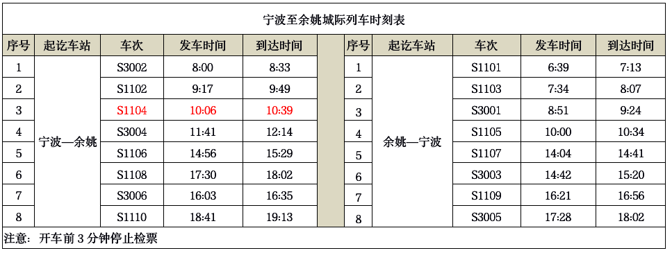 城際鐵路時刻調(diào)整后,寧波至紹興(錢清)維持每天3對,時刻不變。寧波至余姚維持每天8對,但其中,從寧波發(fā)開往余姚的S1104次,發(fā)車時刻從目前的上午9點39分,調(diào)整到10點06分發(fā)車,調(diào)整后到達時刻為10點39分。其余車次時刻維持不變。