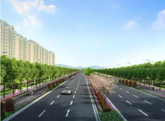 工程路線全長(zhǎng)約1957米,道路標(biāo)準(zhǔn)橫斷面寬度為44米,設(shè)雙向六車(chē)道機(jī)動(dòng)車(chē)道。