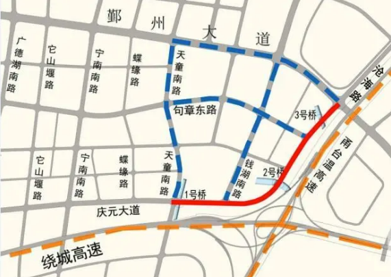 沿線相交道路主要有天童南路、錢(qián)湖南路、句章東路及鄞州大道。新建跨河橋梁3座,實(shí)行排水管道雨污分流。