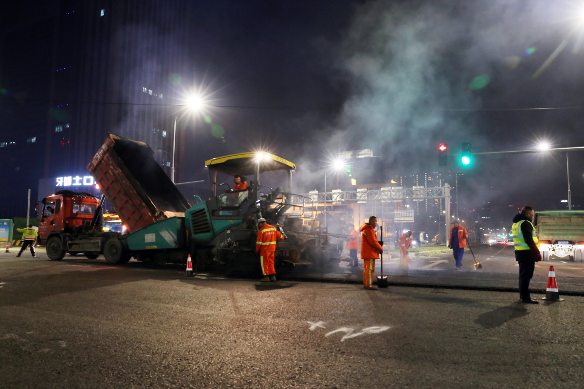 從2月28日晚9時開始,在鄞縣大道天童南路口施工現(xiàn)場,近20臺瀝青車源源不斷地運來施工材料,經過高溫加熱的瀝青冒出騰騰熱氣,被攤鋪機傾倒在路面。隨后,工人們“趁熱打鐵”,在推土機、壓路機等大型機械的協(xié)助下,以最快的速度用鐵鍬把瀝青迅速攤平、反復碾壓,確保道路面層瀝青粘合密實。至3月1日凌晨5時,該路口完成瀝青攤鋪作業(yè),出行環(huán)境大幅提升。