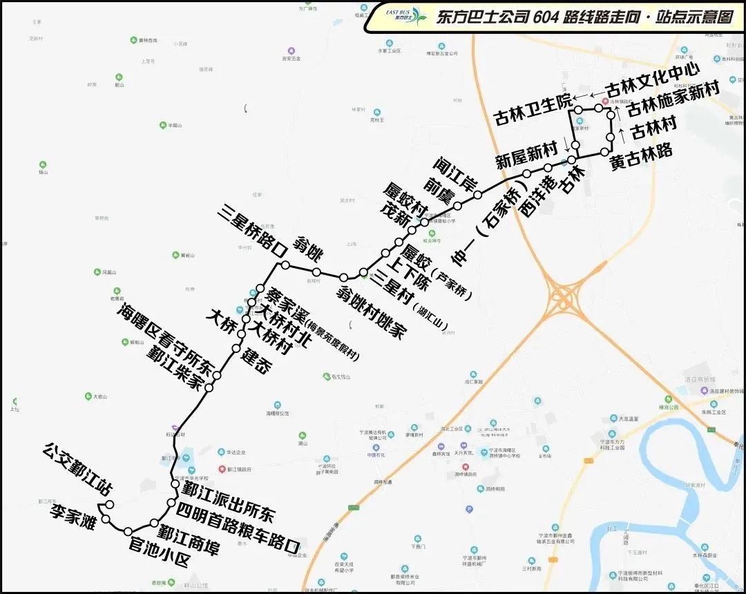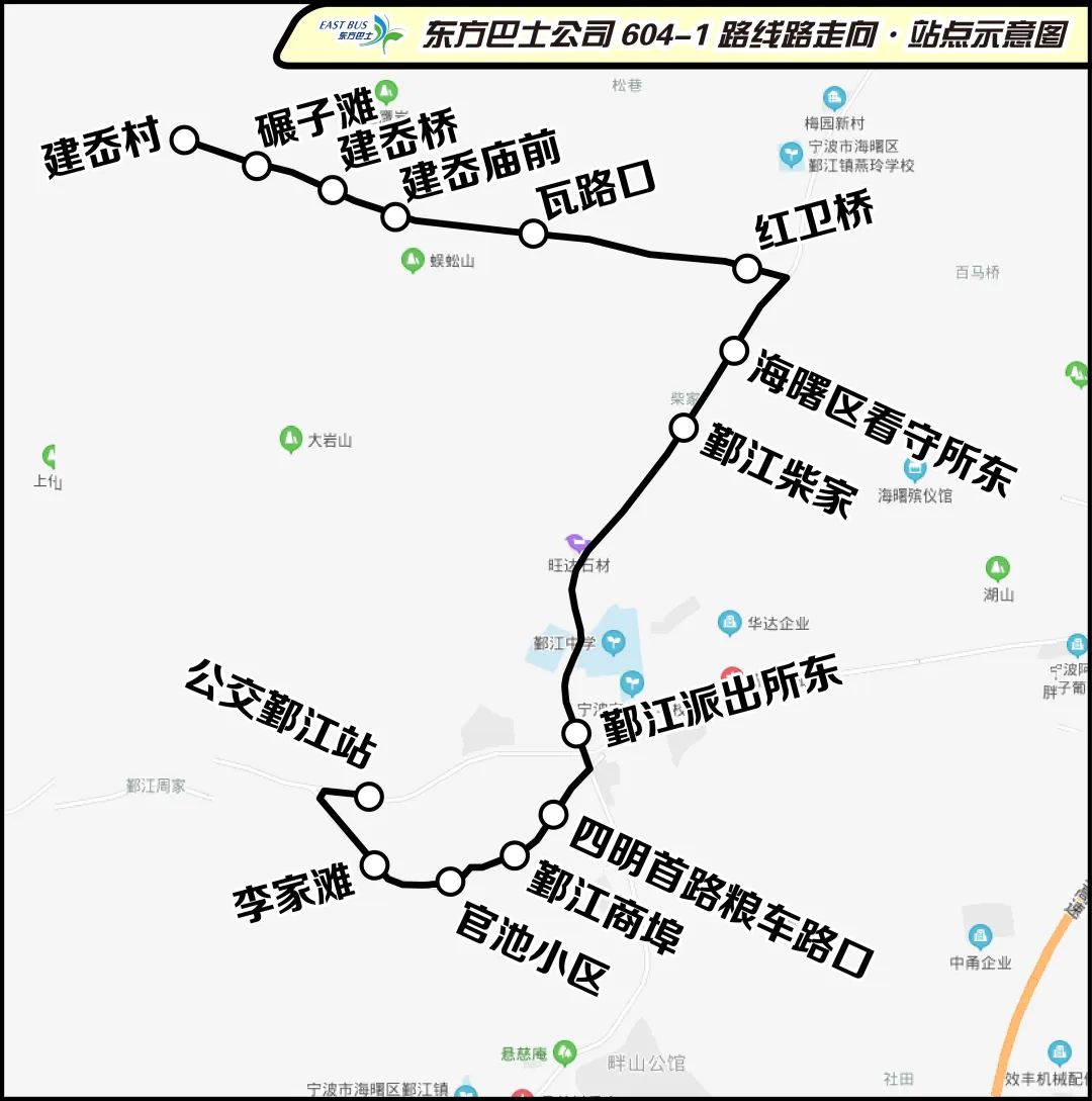 二、公交鄞江站經建岙村至黃古林路的部分604路建岙班次調整為公交鄞江站至建岙村運營,并編碼為604-1路