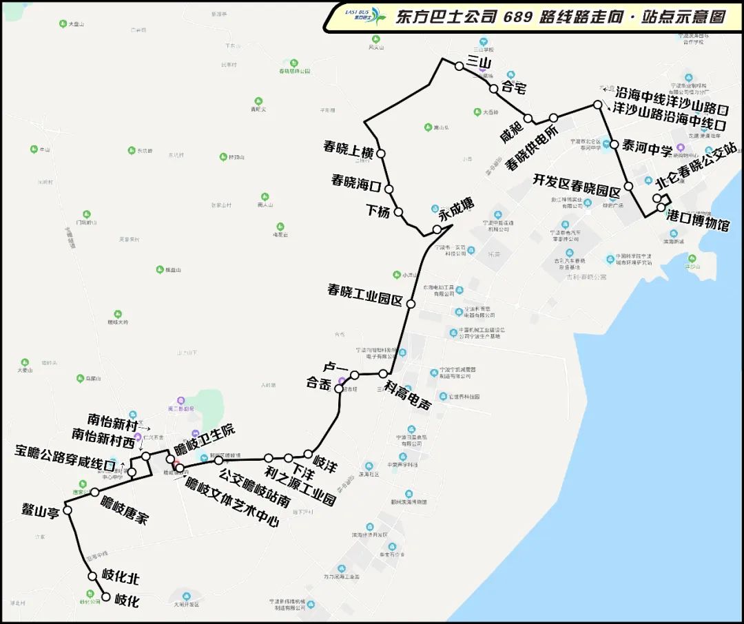一、岐化至公交濱海站689路調整為岐化至北侖春曉公交站運營
