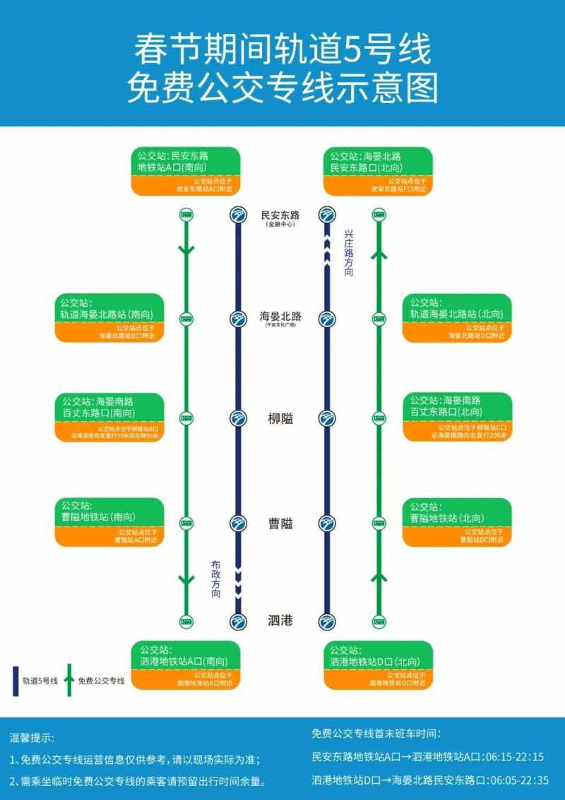 因施工需要,寧波地鐵5號線部分區(qū)段需臨時停運(yùn),為最大限度降低對乘客出行的影響,充分利用春節(jié)客流低谷,決定于2023年1月21日至1月27日(除夕至初六),5號線民安東路站至泗港站區(qū)段臨時停運(yùn),開行免費(fèi)公交專線。1月28日起地鐵全線恢復(fù)正常。