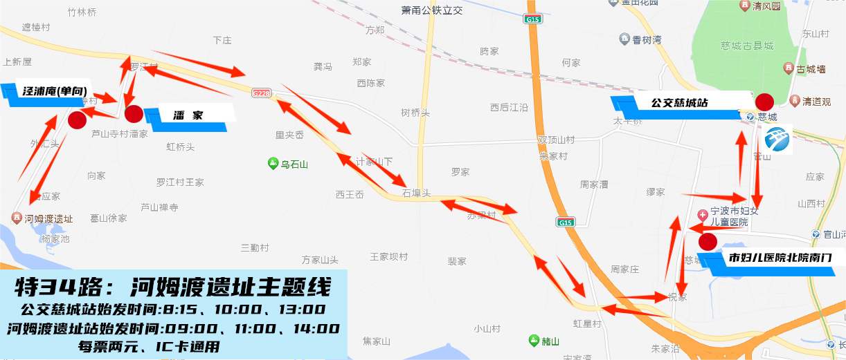 該線從公交慈城站出發,沿途經過市婦兒醫院北院南門、潘家、涇浦庵(單向),最終到達河姆渡遺址。公交慈城站始發時間分別為8:15、10:00、13:00,河姆渡遺址站始發時間分別為09:00、11:00、14:00,單程45分鐘,市民朋友可乘坐軌道交通4號線至慈城站后換乘特34路前往河姆渡遺址。