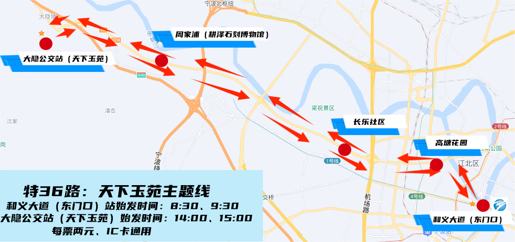 該線沿途經過公交梅竹路站↓、梅竹路中官新路口↑、孔浦中學、怡江新村、三官堂(浙江紡織服裝學院)、寧波大學,最后抵達永旺村。公交梅竹路站始發時間分別為:8:45、10:00、11:30,永旺村委站始發時間分別為:9:15、10:30、12:10。單程20分鐘,線路沿線經過軌道二號線孔浦站、三官堂(浙江紡織服裝學院)站、寧波大學站,市民朋友可在這些站點進行換乘。