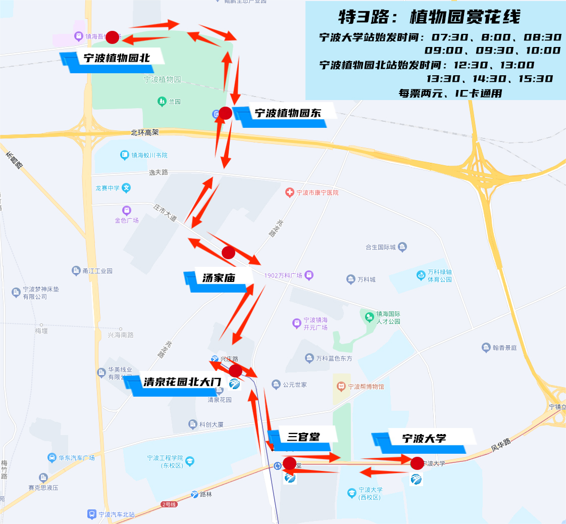 該線從寧波大學、三官堂(浙江紡織服裝學院)、清泉花園北大門、湯家廟、寧波植物園東、寧波植物園北。寧波大學站始發時間:07:30、8:00、08:30、09:00、09:30、10:00 。寧波植物園北站始發時間:12:30、13:00、13:30、14:30、15:30。單程時間20分鐘。線路沿線經過軌道交通2號線寧波大學站、三官堂(浙江紡織服裝學院)站、軌道交通5號線興莊路站,市民可進行公交地鐵換乘。