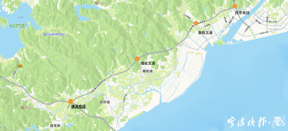 項目起點位于北侖春曉昆亭村,終點位于鄞州塘溪鸛山村,全長約24.15公里,設有昆亭樞紐、春曉互通、瞻岐互通、塘溪樞紐四座互通式立交。
