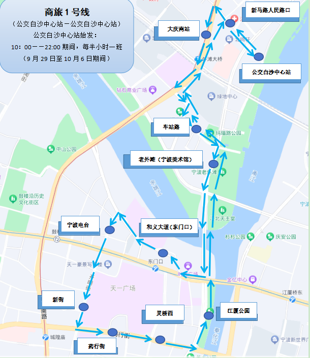 9月29日-10月6日,商旅1號線運營時間從19:00至22:00,調整為10:00至22:00。