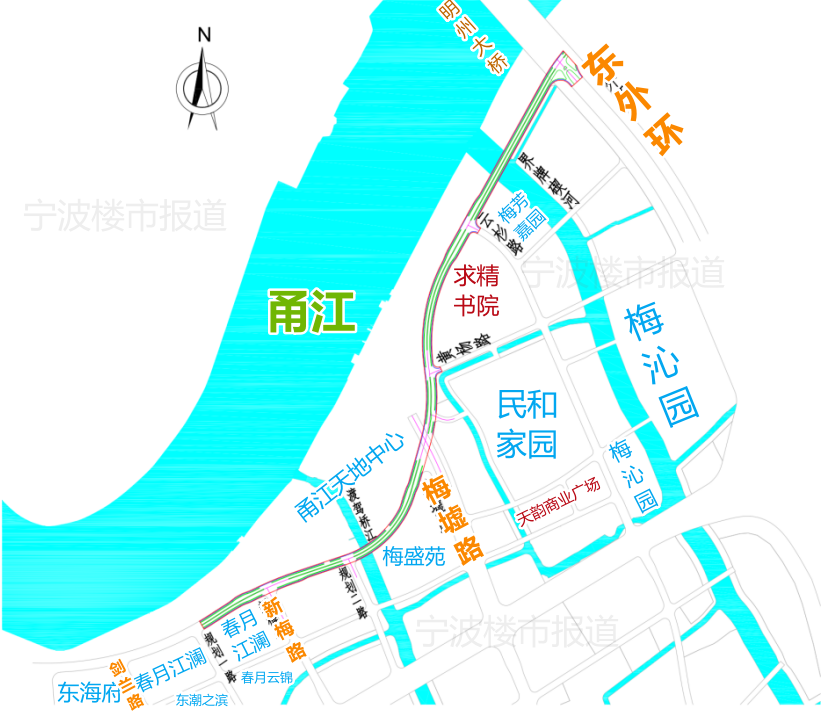 要新建的這段甬江大道,西起劍蘭路東側(cè)規(guī)劃路,順接已建段甬江大道,東至現(xiàn)狀東外環(huán),全長約2.1公里。線路走向圖示如下: