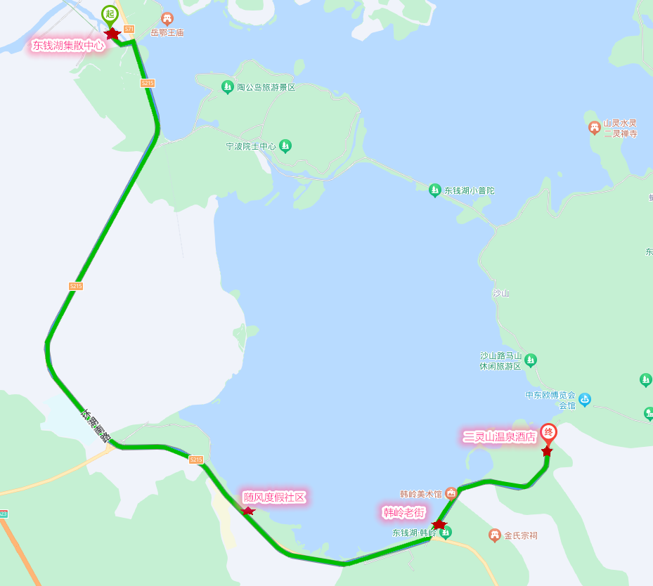 1、東錢湖南線旅游快速線(東錢湖集散中心至二靈山溫泉酒店)站點設置:東錢湖集散中心、隨風度假社區、韓嶺老街、二靈山溫泉酒店。