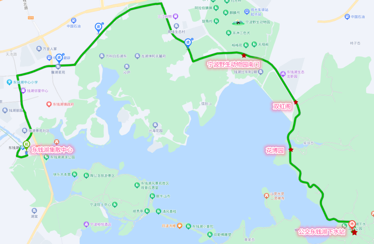 2、東錢湖北線旅游快速線(東錢湖集散中心至公交東錢湖下水站)站點設置:東錢湖集散中心、寧波野生動物園南門、雙虹閣、花博園、公交東錢湖下水站。
