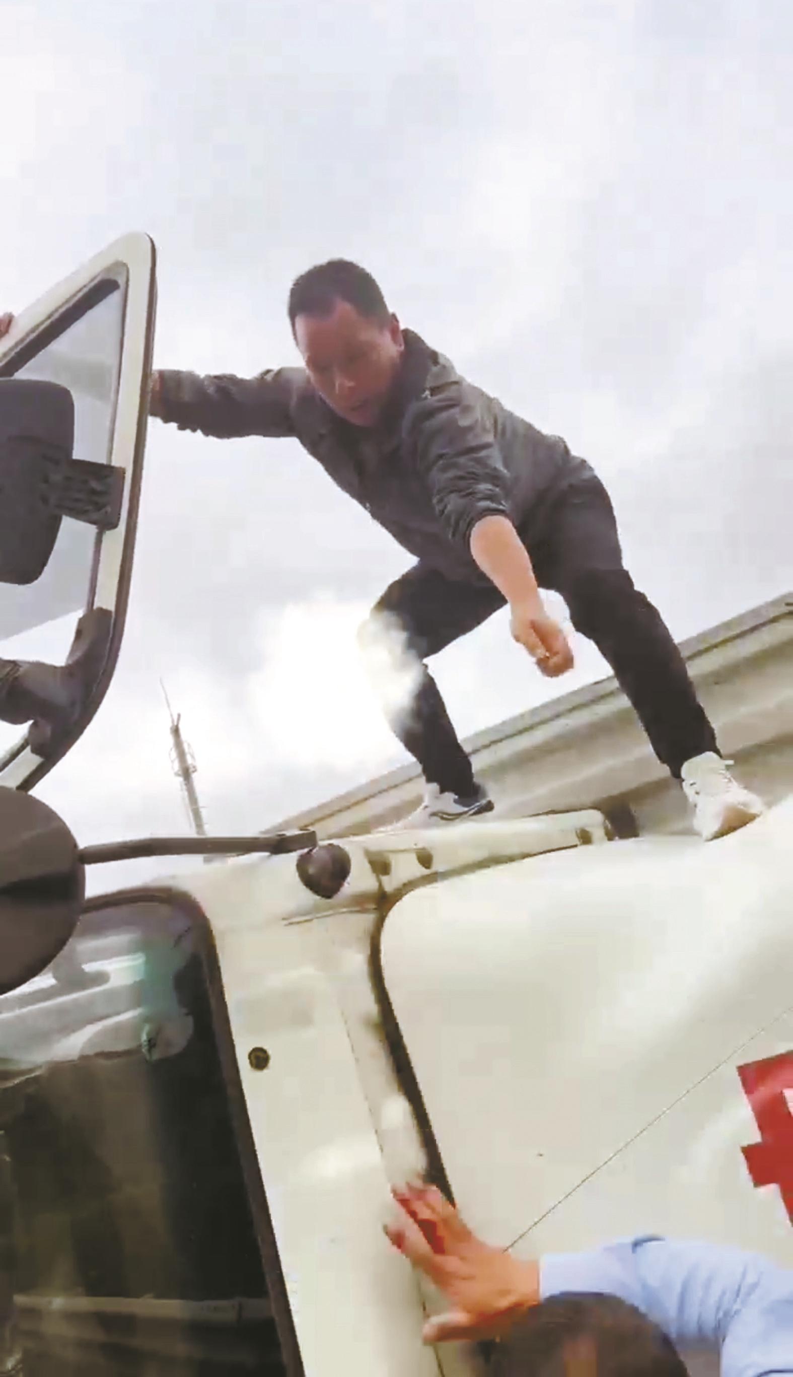 公共視頻顯示,一輛小型轎車靠邊停車,一男子立即下車沖到事故車前,果斷爬上車頂,掀開車門。同時,又有2名熱心司機趕來幫忙。大家一起努力,將被困司機及時拉出車門。