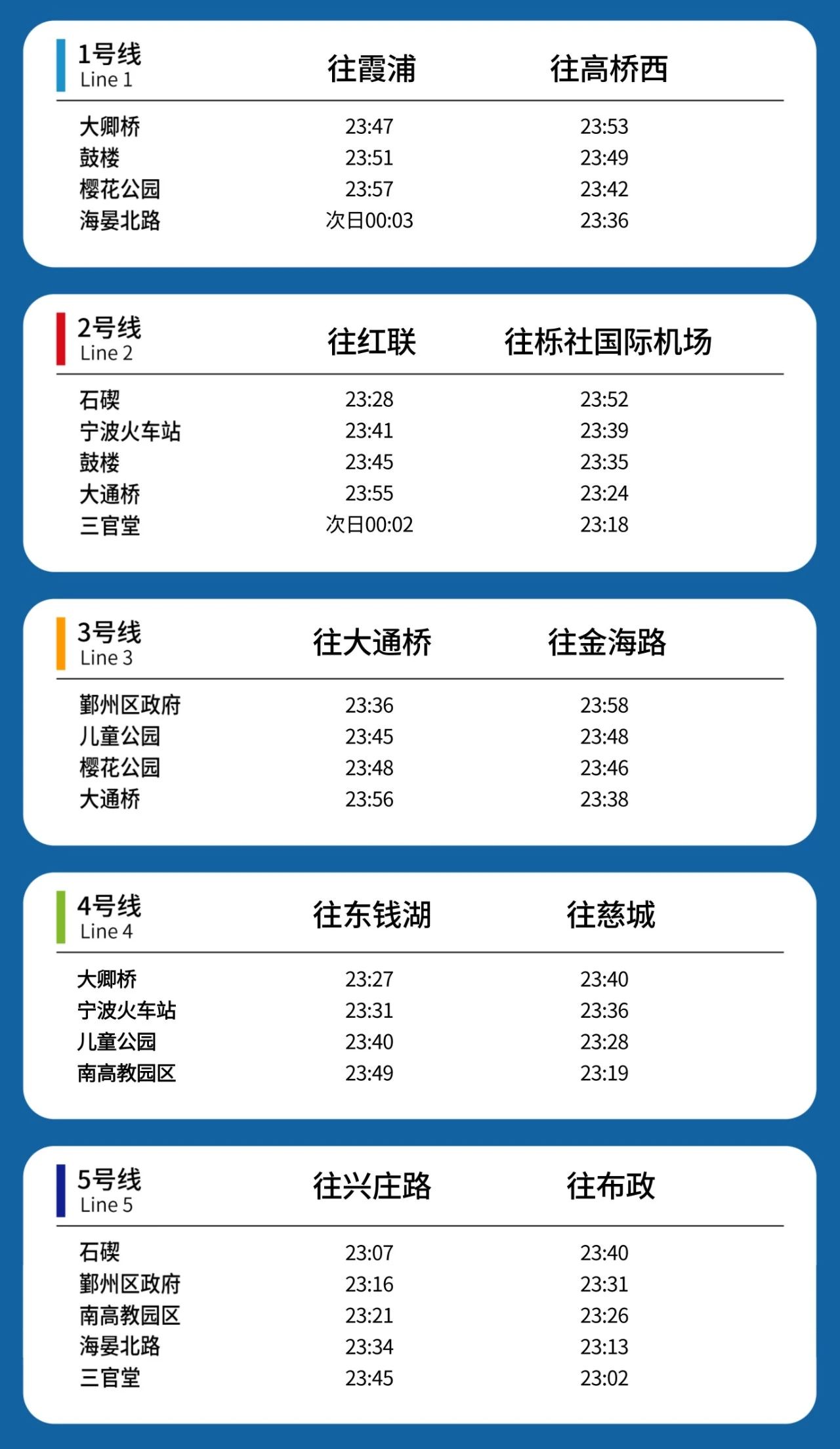 4號線慈城往東錢湖方向為23:00,東錢湖往慈城方向為23:10;