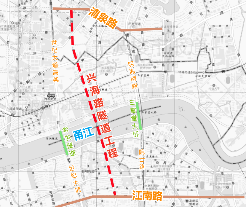 這條跨甬江的隧道,就在常洪隧道和三官堂大橋中間。位置參考圖示如下: