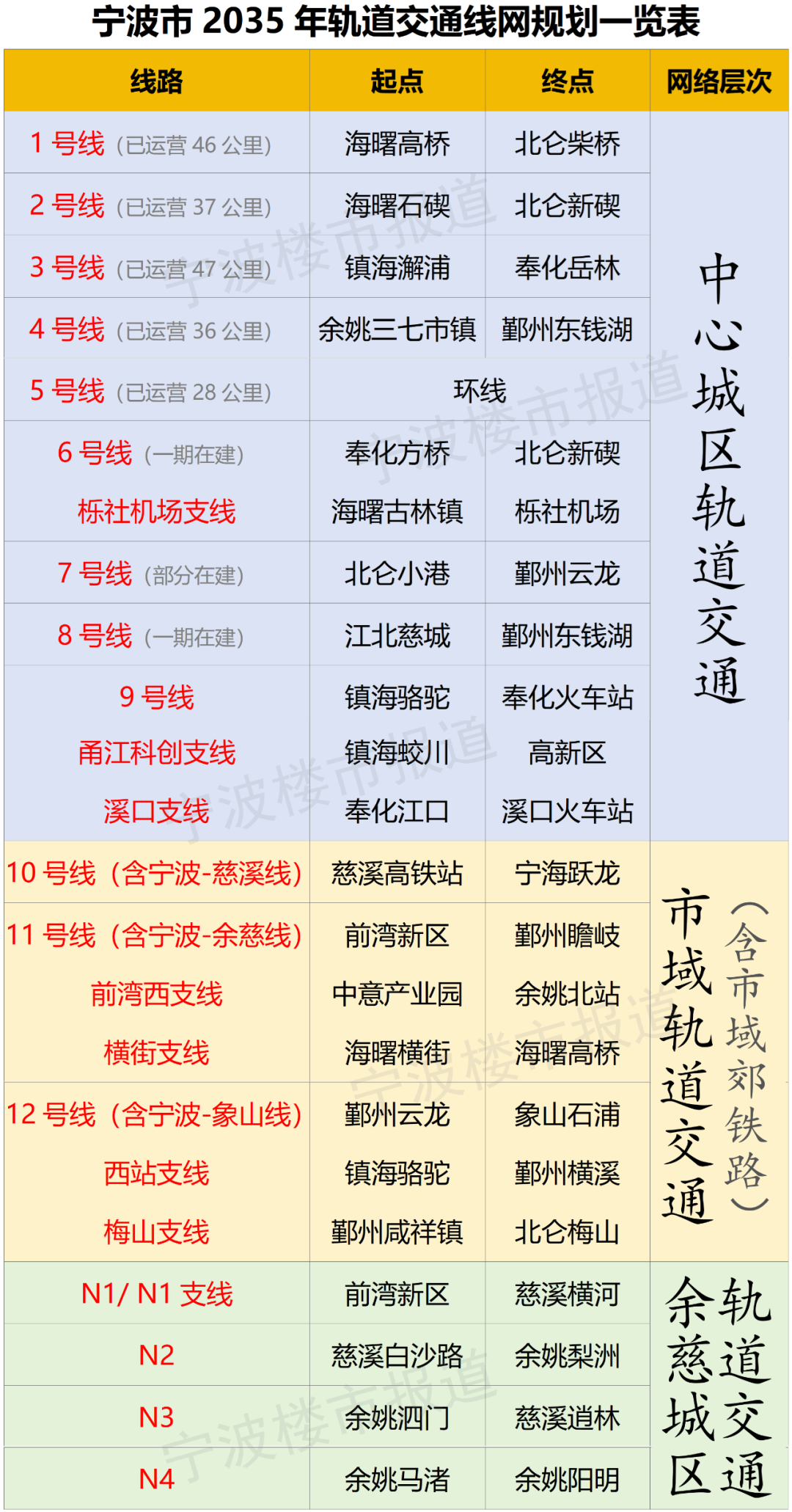寧波市2035年軌道交通線網規劃一覽表。圖源:寧波樓市報道