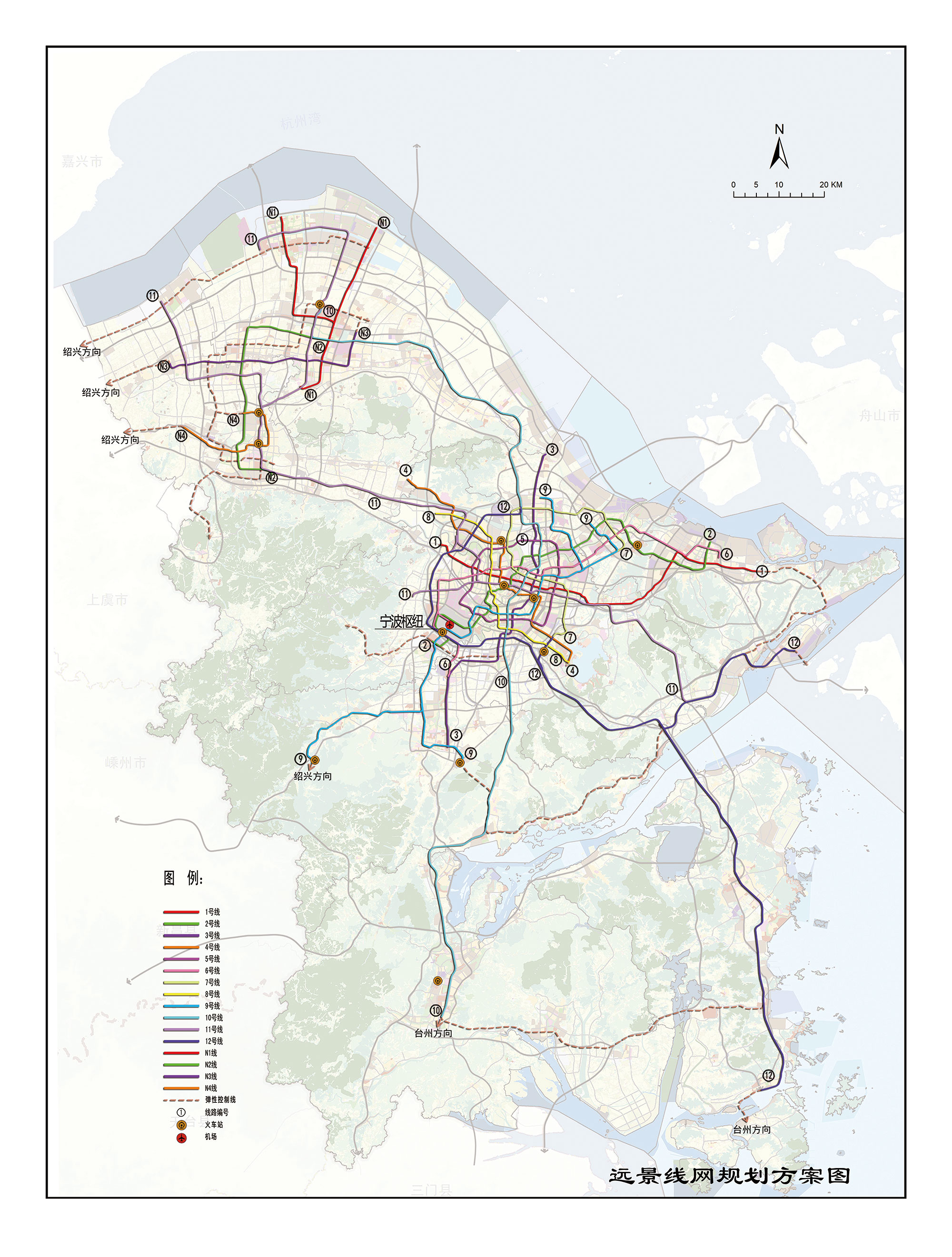 遠期線網由16條線組成,包括中心城區軌道交通1~9號線,市域軌道交通(含市域/郊鐵路)10~12號線,余慈城區軌道交通N1~N4號線。全網總規模1162.5公里,其中市域軌道交通(含市域/郊鐵路)線網總規模494.2公里,中心城區軌道交通線網總規模525.2公里,余慈城區軌道交通線網總規模143.1公里。