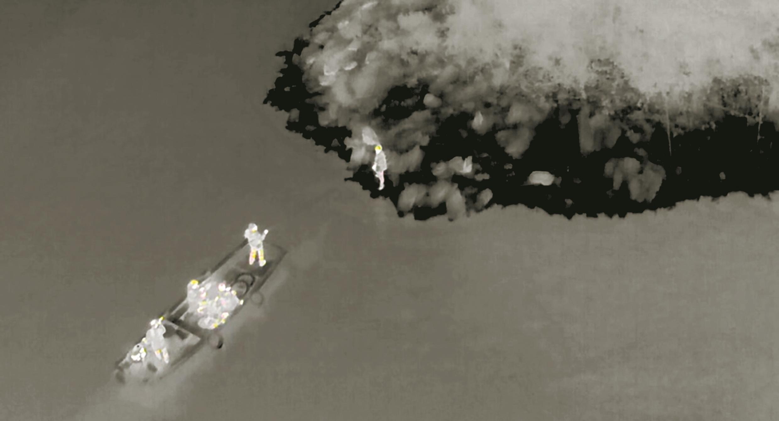 一個半小時后,無人機“飛手”鎖定了一個熱成像圖源,就是被困人員。但其所處的位置很“糟糕”——在山的另一側,周邊被水域包圍,地面救援人員繞山路趕過去需要兩個小時。后來,沖鋒艇抵達,在無人機的指引下,救援人員通過水路趕往事發地,成功救出被困者。