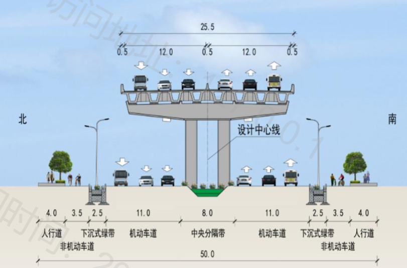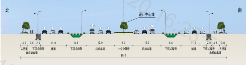 快速路主線布置為雙向6車道,設(shè)計(jì)車速為80公里/小時(shí);地面輔道建設(shè)規(guī)模為雙向6車道,設(shè)計(jì)車速為50公里/小時(shí)。高架段標(biāo)準(zhǔn)斷面寬度50米,地坪段標(biāo)準(zhǔn)斷面寬度88米。