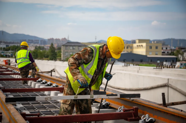 為保證列車高速、安全、平穩運行,現場對軌道的鋪設精度提出了高標準。從道床鋼筋綁扎到軌枕、鋼軌安裝,再到線路精調,每一道工序都要求將誤差把控在“毫米級”范圍。