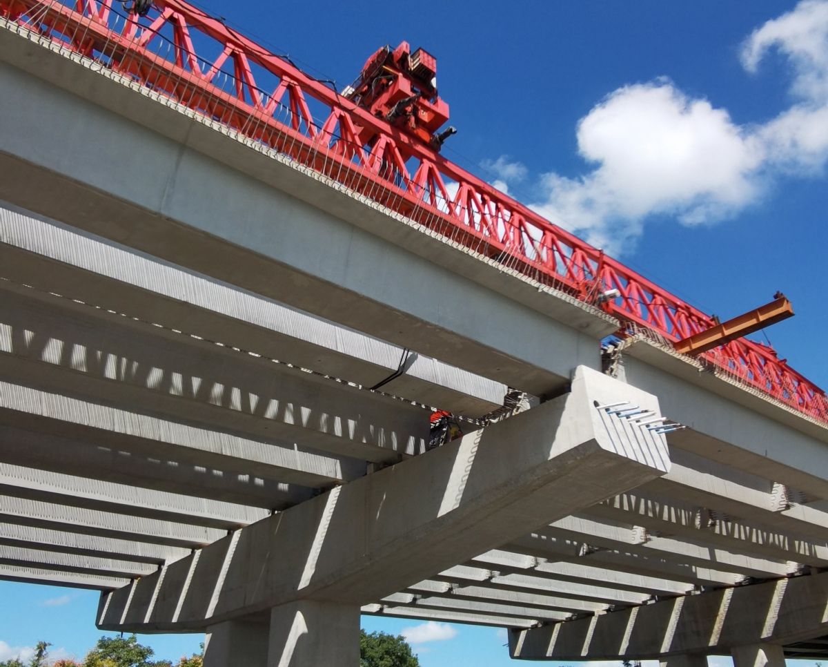 作為橋梁主體結(jié)構(gòu)班組負責人,義烏人陳豐溪正站在已架設(shè)好的梁板旁,指著梁面告訴記者:“每塊梁板架設(shè)的時候都得做到‘穩(wěn)、平、準’,不然影響后續(xù)的瀝青攤鋪。”