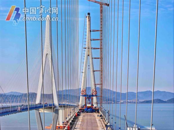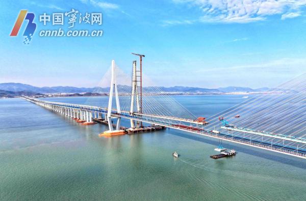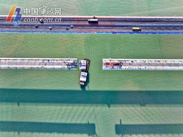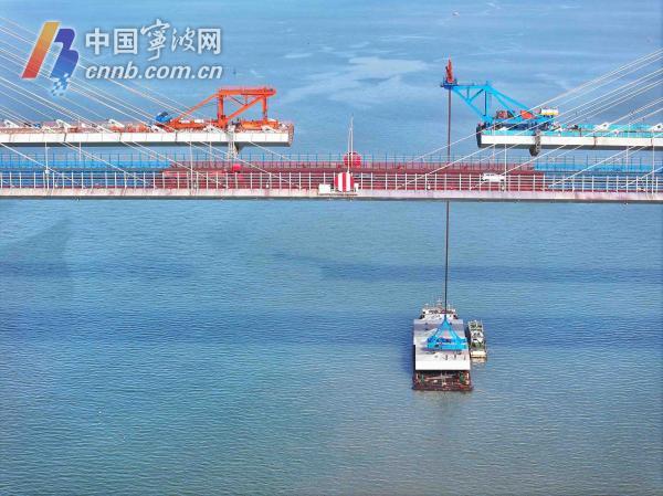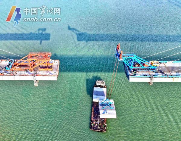 象山港畔,運梁船精準就位,建設者們手持對講機反復協調確認。兩座“鉆石”造型的雙子星塔之間,鋼箱梁緩緩升空,海面保障船舶巡回護航,海陸協同上演著跨海筑橋的奮進圖景。