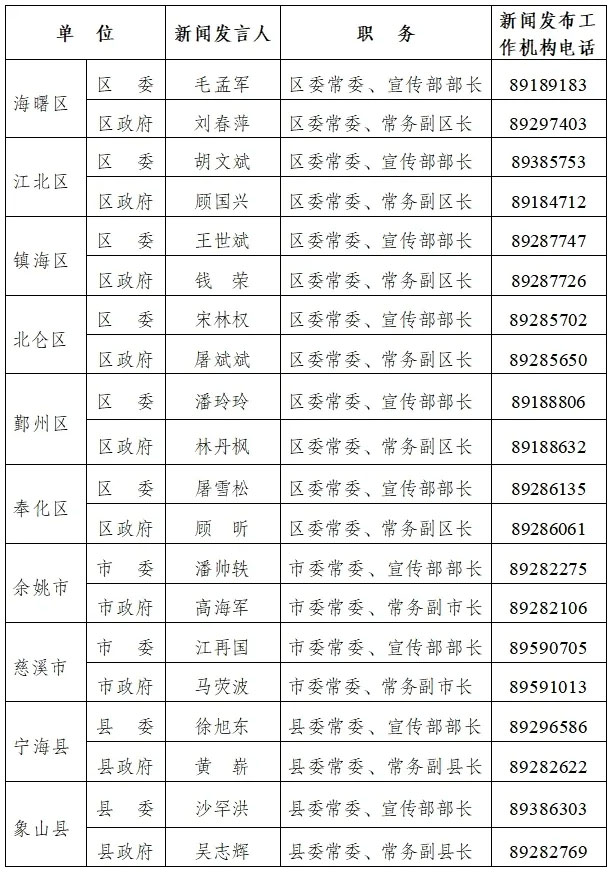 寧波市各區(縣、市)黨委、政府新聞發言人名單及新聞發布工作機構電話