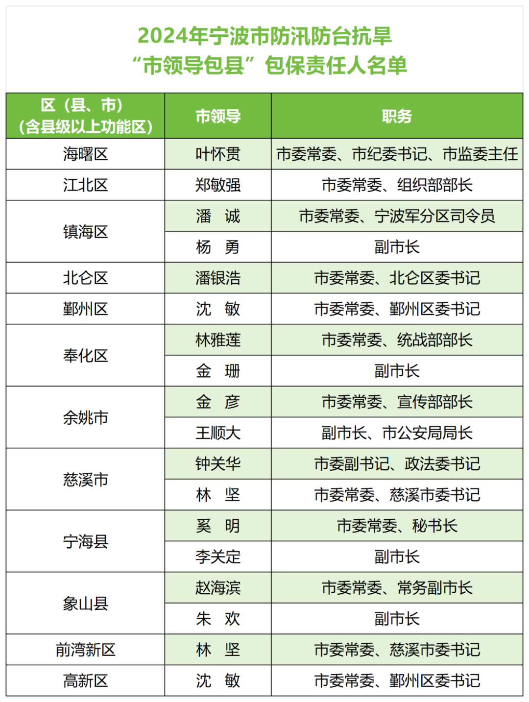 寧波市人民政府防汛防臺(tái)抗旱指揮部公布2024年度防汛防臺(tái)抗旱行政責(zé)任人及“市領(lǐng)導(dǎo)包縣”“縣領(lǐng)導(dǎo)包鄉(xiāng)”包保責(zé)任人名單。