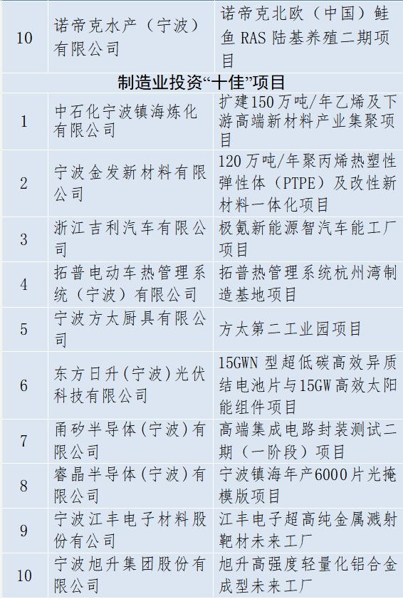 2023年度寧波市招商引資與制造業(yè)投資雙“十佳”項(xiàng)目名單