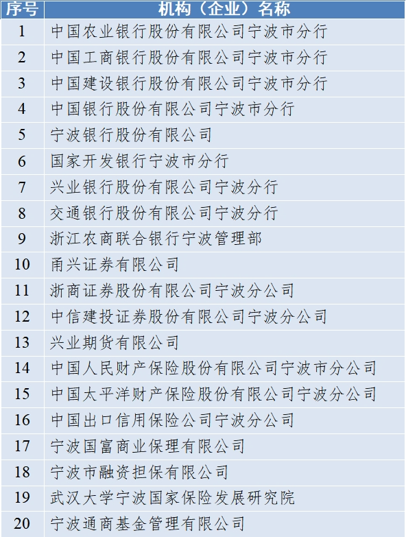 2023年度寧波市金融支持實(shí)體經(jīng)濟(jì)發(fā)展貢獻(xiàn)突出20家機(jī)構(gòu)名單