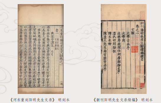 《河東重刻陽明先生文錄》(明嘉靖三十二年刻本)由王陽明弟子黃綰、歐陽德等匯編,書中主要記載王陽明與諸弟子講學明道之文章以及王氏詩賦、序言、記說、墓表等作品;《新刊陽明先生文錄續編》(明嘉靖十四年刻本)作為貴陽刊行的善本,收錄300多篇詩文,內容涉及其思想、生活、交游等多個方面,還含《王文成公全書》未收的佚作,對研究和傳承王學經典具有重要文獻價值。