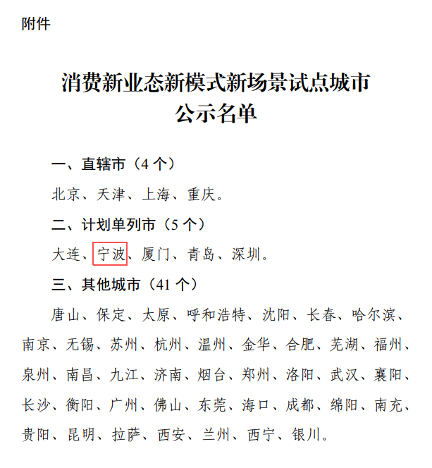 11月20日,商務部網站公布了消費新業態新模式新場景試點城市競爭性評審結果公示,確定了包括寧波在內50城入選。公示時間截至28日。